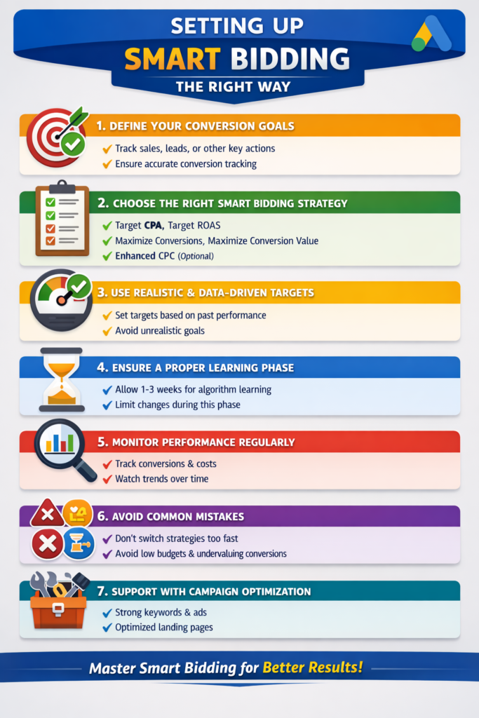 Smart bidding is a tool, not a strategy on its own. It works best when combined with strong account structure, relevant keywords, compelling ad copy, and optimized landing pages.